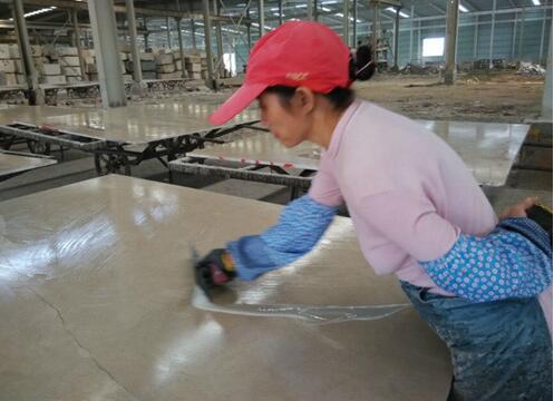 5.加工:膠在未完全固化前,應(yīng)將石板靜置平放,切不可疊放。多余的膠,未固化前可用刮刀去除。打磨拋光等操作應(yīng)在膠水完全固化后才能進(jìn)行。