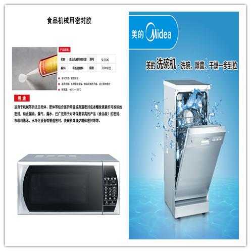 美的生產(chǎn)的洗碗機上就選用了世林膠業(yè)生產(chǎn)的SL5106食品級耐高溫密封膠,用在產(chǎn)品的間隙處,完全解決了耐高溫,防水,防塵,耐候性強,可拆卸等問題。